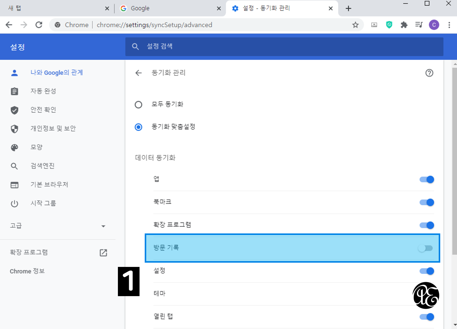 추가적인 설정으로 동기화 관리 옵션에서 보이는 것과 같이 [방문 기록] 옵션 항목을 비활성화 시켜주도록 한다. 이는 모바일 구글 계정과 동기화 설정이 되어 있을 경우, 스마트폰의 연결 계정의 히스토리가 컴퓨터에 영향을 미치지 않도록 해주는 역할을 한다.