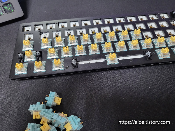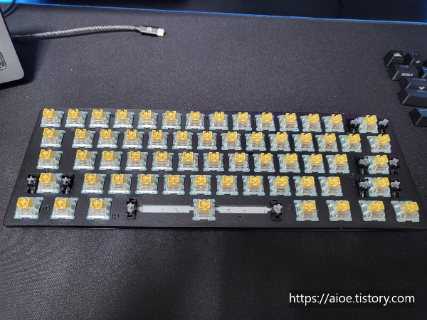 기존에 광축과 적축 제품을 가지고 있었기 때문에 이번 키보드는 저적으로 구매를 했다. 일전에 방출한 저적 제품이 퍽 나쁘지도 않았을 뿐더러, 어차피 핫스왑으로 다른 스위치를 사용할 생각이라. 크게 중요한 부분이 아니었다. 스위치 같은 경우, 가성비를 갖추고 있는 바다소금으로 선택했다(k70 pro mini의 경우 3핀 스위치를 지원하고 있기 때문에 5핀 스위치의 경우 2개의 핀을 니퍼로 날려야 했다). 체리스위치 기성품에서는 느낄 수 없는 저렴하면서도 독특한 키감과 키음이 완전 취향이었다.