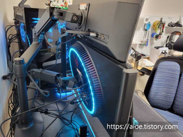 다만 한가지 아쉬운 것은 모니터 뒷면의 RGB 영역으로 모니터 앰비언스 라이트 기능을 갖추고 있는데, 이부분의 마감이 크리스탈 형태로 개인적인 취향에는 부합하지 않는 디자인이라는 점이다. 하지만 라이트 효과를 그럭저럭 봐줄만 했고, 보이지 않는 뒷면이기 때문에 큰 문제는 되지 않았다.